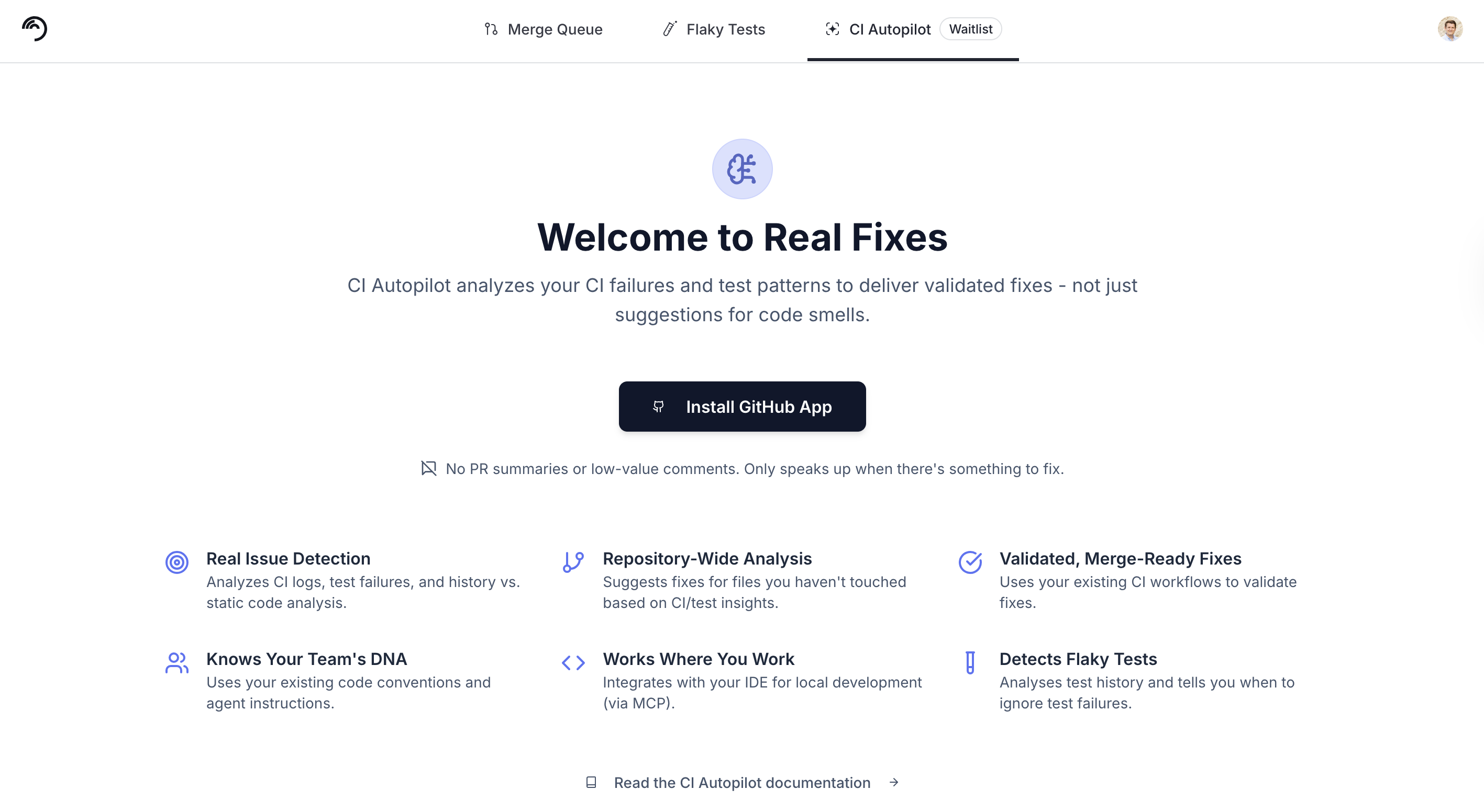 **✅ Success: You see the CI Autopilot welcome screen with an 'Install GitHub App' button**