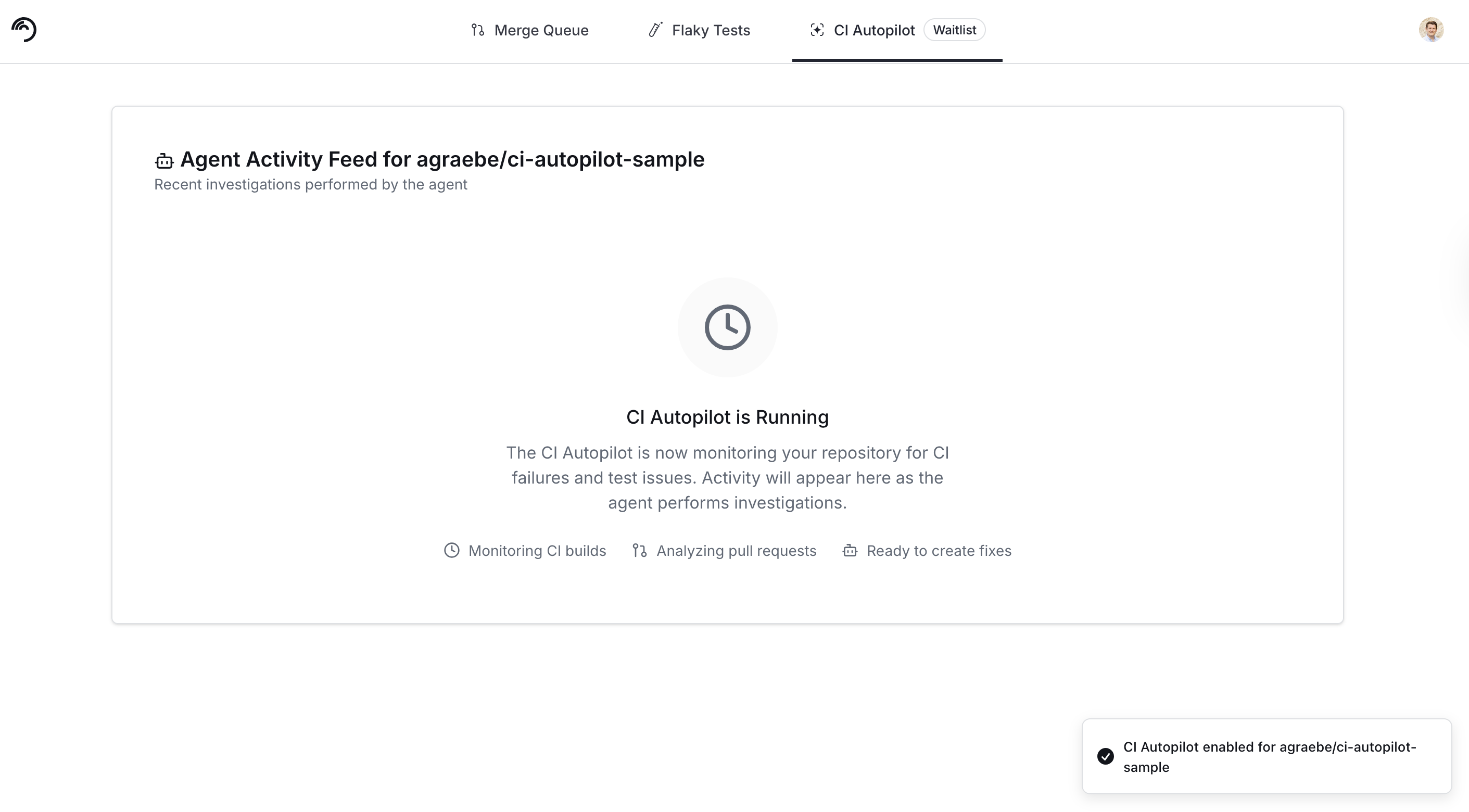 <figure><img src="https://577236045-files.gitbook.io/~/files/v0/b/gitbook-x-prod.appspot.com/o/spaces%2F61Ep9MrYBkJa0Yq3zS1s%2Fuploads%2Fgit-blob-77622a32473b620d07625c5818c956ce28cce610%2FScreenshot%202025-09-11%20at%202.41.58%E2%80%AFPM.png?alt=media" alt=""><figcaption><p>Empty activity feed after CI Autopilot was enabled</p></figcaption></figure>