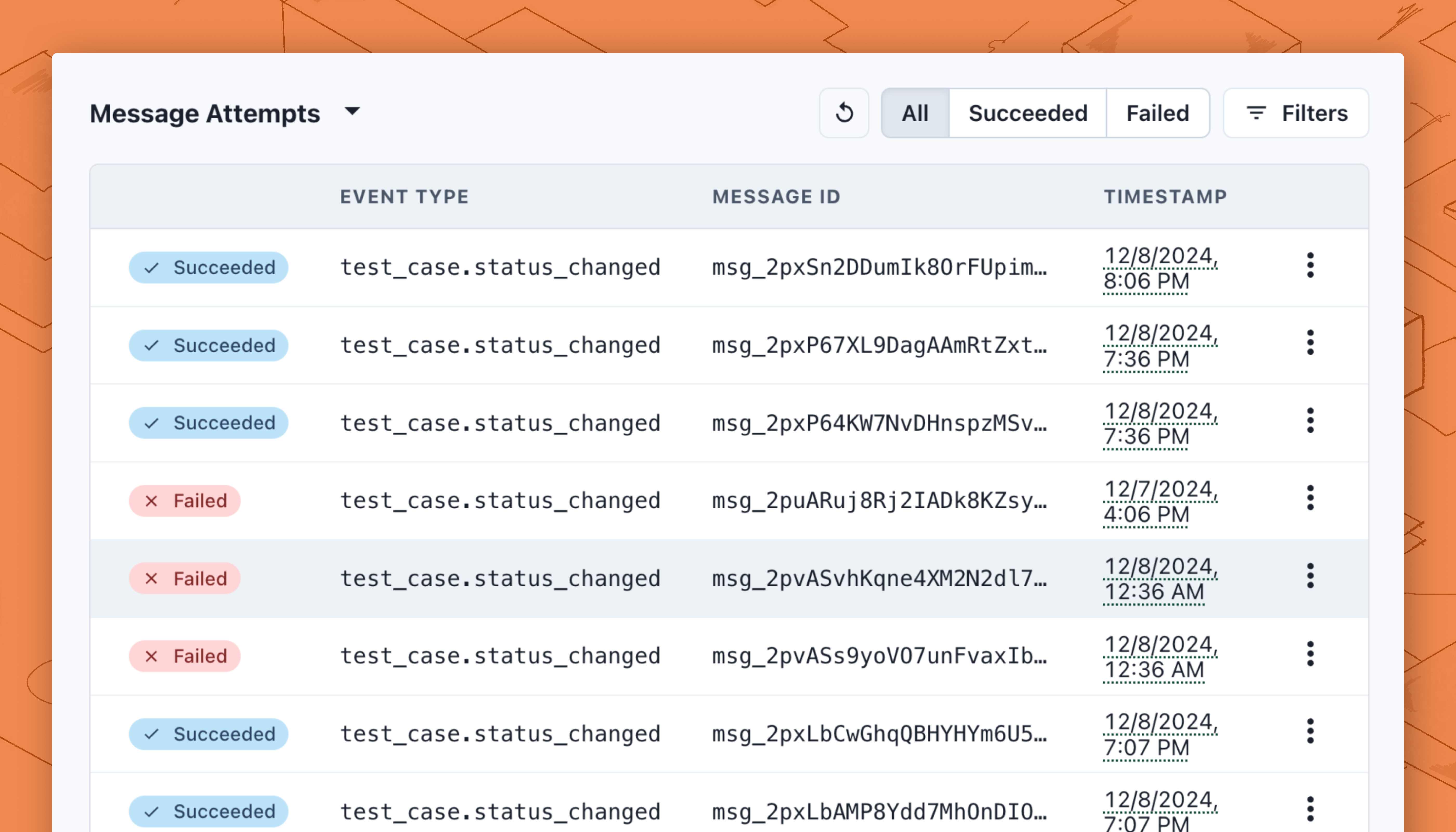 You can see a list of past delivery attempts in the **Message Attempts** modal. You can filter this list by **Succeeded** and **Failed** status, and you can click on each message to see the **Message content**, response code, and error message of each attempt. You can learn more about [replaying messages](https://docs.svix.com/receiving/using-app-portal/replaying-messages) and [filtering logs](https://docs.svix.com/receiving/using-app-portal/filtering-logs) in the Svix docs.