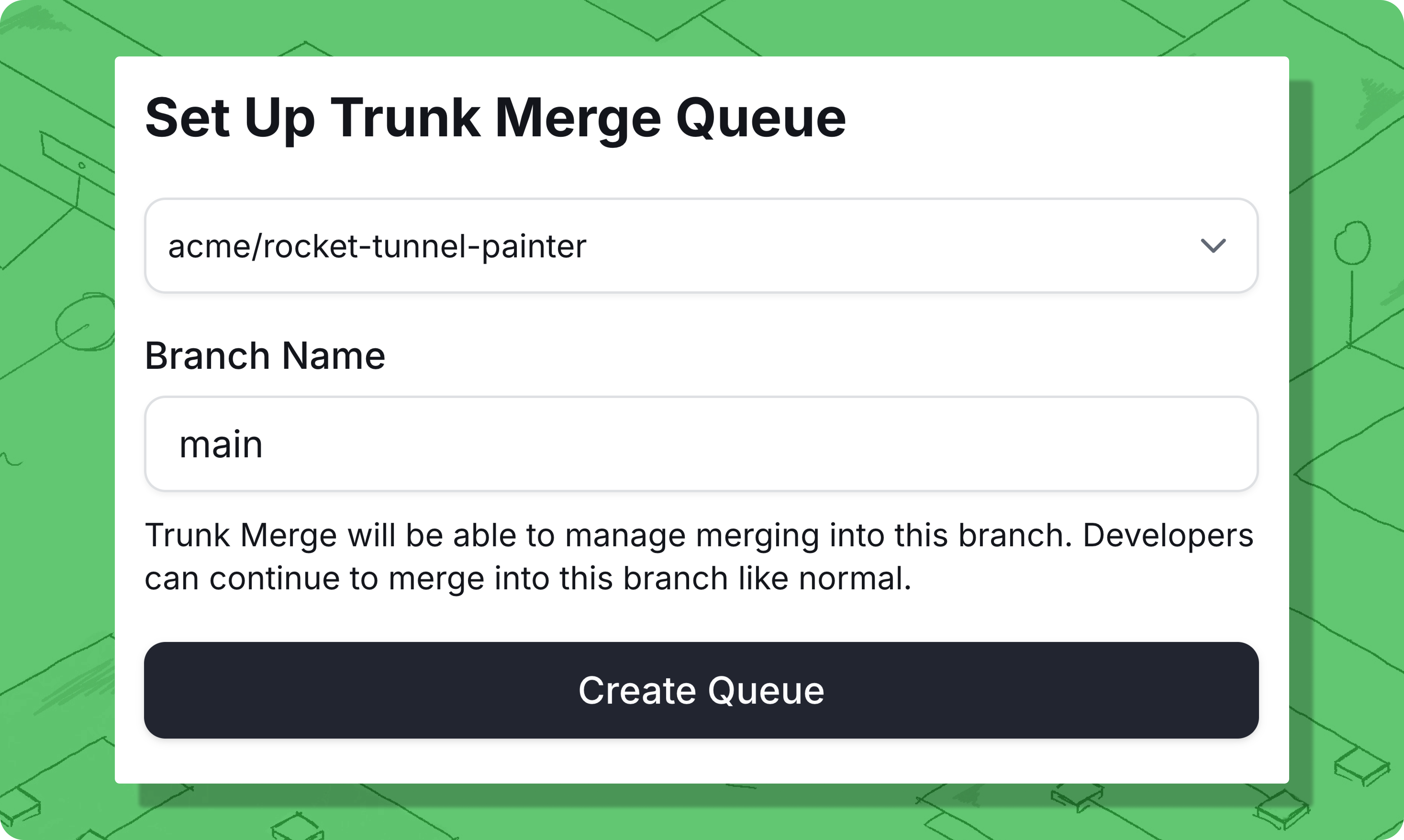 This guide walks you through setting up Trunk Merge Queue for your repository. The setup process involves installing the GitHub App, creating a queue, and configuring branch protection rules to allow the merge queue to function properly.